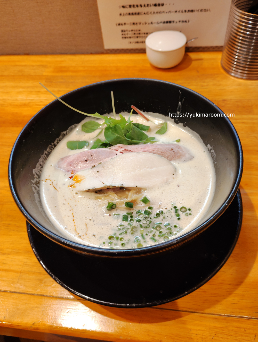 皆さん食したらすぐに出ていかれるようで、すぐに順番が回ってきて着席。足元に荷物置きのかごがあり、そこへ荷物を入れてラーメンを待っていると、ほどなくして注文した伊勢海老らぁめんが来ました。